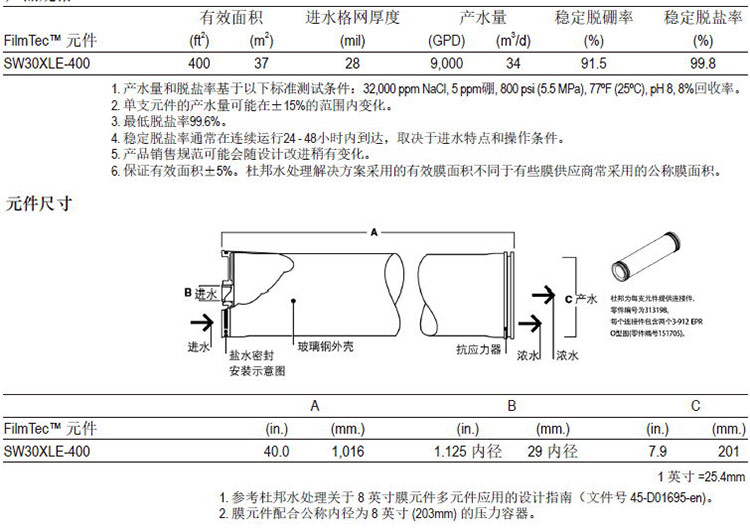 杜邦FilmTecTM SW30XLE-400元件极好的将产水量和脱盐率组合在一起。当设计两级海水淡化或高TDS苦咸水系统时,该产品是最理想的选择。