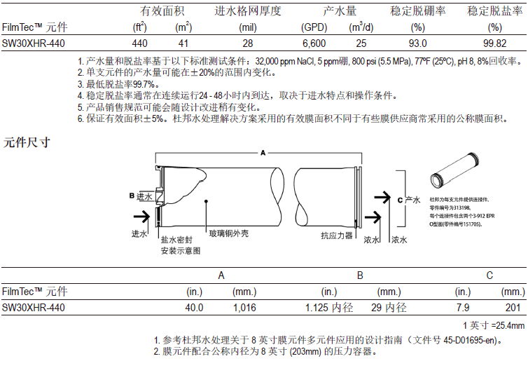在杜邦FilmTecTM产品系列里,SW30XHR-440元件是脱盐率最高的海水反渗透膜元件,多数情况下,采用一级海水反渗透系统就可达到严格的水质要求。此外,最高有效膜面积和较宽进水格网的组合,能够提高生产率,降低清洗频率,从而实现可持续的较低的运行周期成本。FilmTecTMSW30XHR-440元件有以下优点: