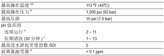 ● pH高于10条件下连续运行的最高温度为95°F(35°C),高于此温度,请咨询技术工程师获取建议