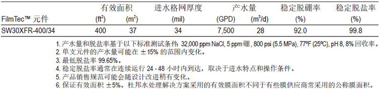 杜邦FilmTecTM SW30XFR-400/34 膜元件设计旨在应对海水淡化系统的生物污染。元件具有先进的抗污染性和清洗可恢复性,能够帮助客户减少化学清洗次数,同时可保持高脱盐率和低能耗。FilmTecTM SW30XFR-400/34元件有以下优点:
