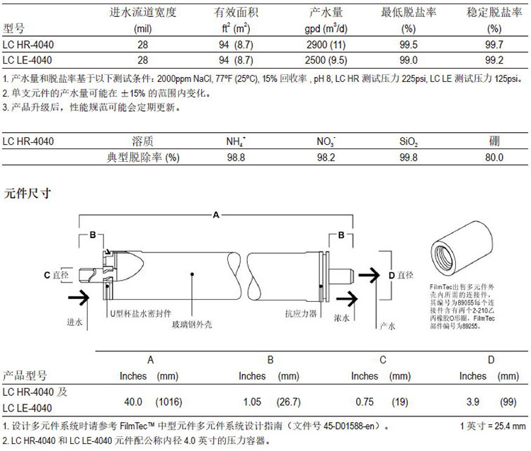 ● LCHR-4040高脱盐率四英寸膜元件,采用杜邦最先进的高脱盐率反渗透膜材料,产水水质更好