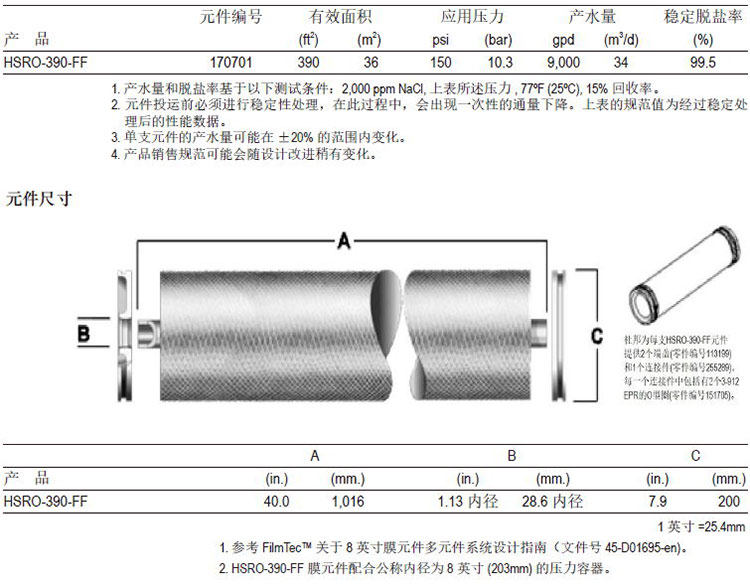 ● 膜两侧的压差必须小于25psi ( 1.7bar)