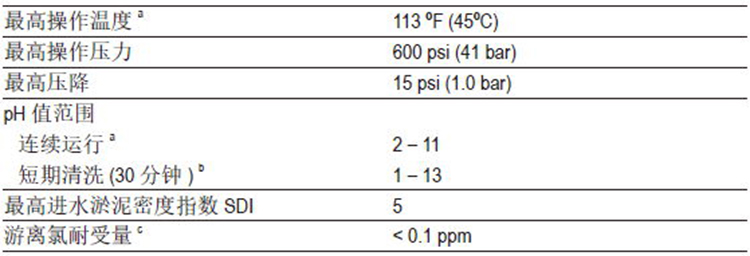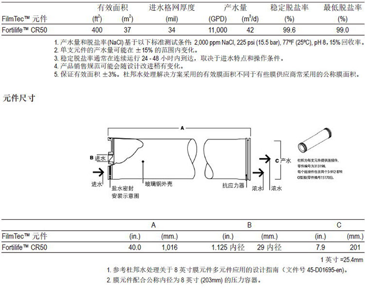 ● FilmTecTMFortilifeTMCR50反渗透膜元件设计在处理有生物污染和有机物污染倾向的水源时可提供更长的膜元件寿命和可靠的系统性能。