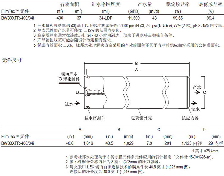 杜邦FilmTecTM BW30XFR-400/34i元件经证明,具有优异的性能: