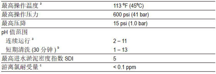 ● pH高于10条件下连续运行的最高温度为95°F(35°C),高于此温度,请咨询技术工程师获取建议