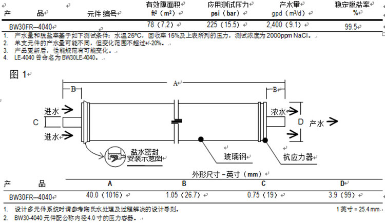 • 陶氏BW30FR-4040成为目前反渗透膜工业界公认的抗污染、性能稳定、产水水质高的反渗透膜元件标准。