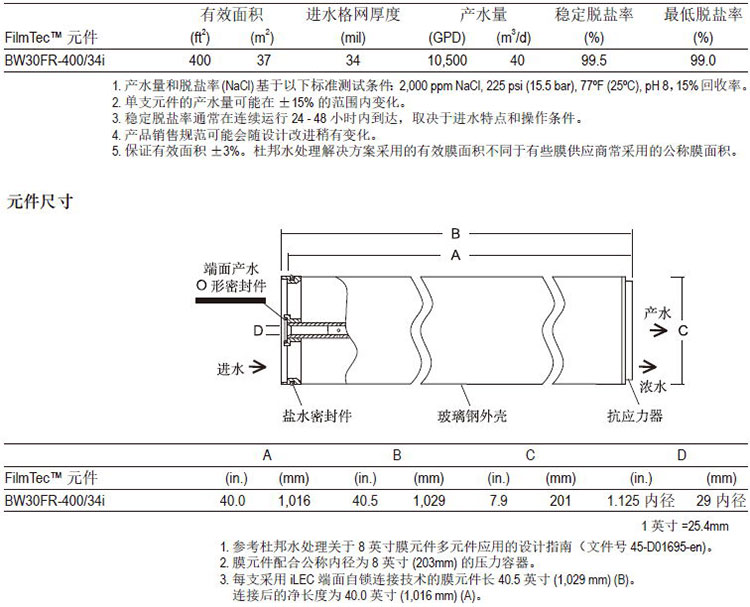 杜邦FilmTecTM BW30FR-400/34i是一款适用于处理高污染水源、同时具有抗污染性、高脱盐率和高产水量的抗污染膜元件。