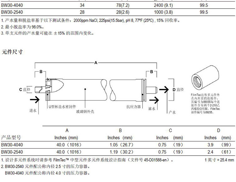 ● FilmTecTM BW30-2540是专门设计适用于产水量小于0.2m3/h (1gpm)但又要求