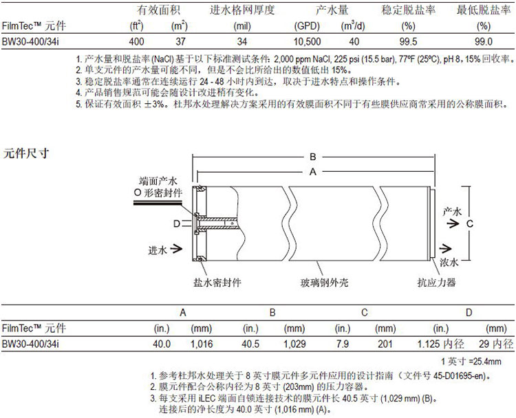 杜邦FilmTecTM BW30-400/34i元件经证明,具有优异的性能: