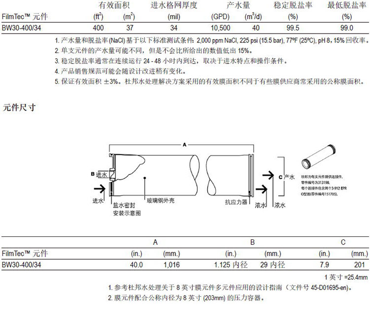 杜邦FilmTecTM BW30-400/34元件经证明,具有优异的性能: