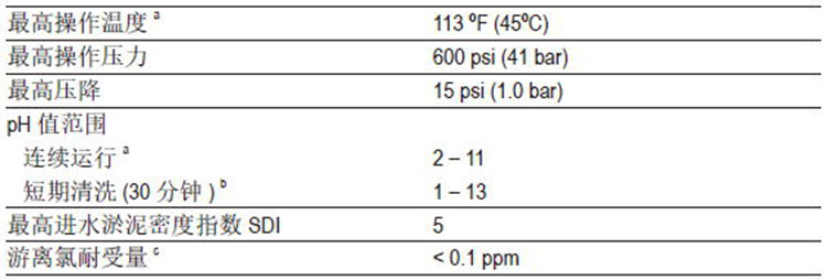 ● pH高于10条件下连续运行的最高温度为95°F(35°C),高于此温度,请咨询技术工程师获取建议