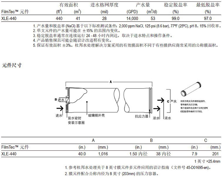 杜邦FilmTecTM XLE-440是最低压力的FilmTecTM反渗透元件: